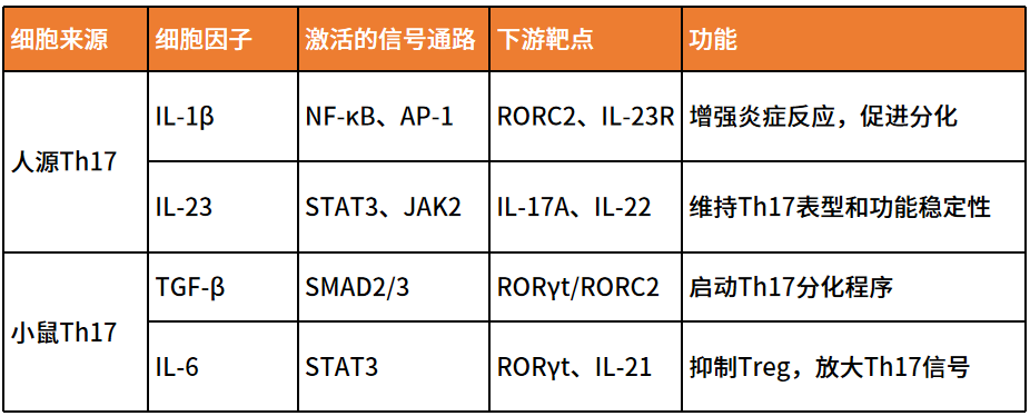 辅助性T细胞17(T helper 17 cell, Th17)作为一类独特的CD4+T细胞亚群,最显著的特点是分泌IL-17家族细胞因子。Th17的特异性转录因子为RORγt/RORC2,区别于T-bet(Th1)和GATA3(Th2),其独特定位功能为抗真菌/胞外菌+驱动自身免疫和慢性炎症,它自2005年被发现以来便成为免疫研究的热点。