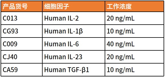 近岸蛋白提供T细胞体外激活培养以及Th17细胞分化的所需的抗体、人源和鼠源细胞因子,包括IL-2、IL-1β、IL-6、IL-23、TGF-β1、抗CD3抗体、抗CD28抗体等,并能提供批间稳定一致的GMP级产品,支持向临床无缝过渡转化。
