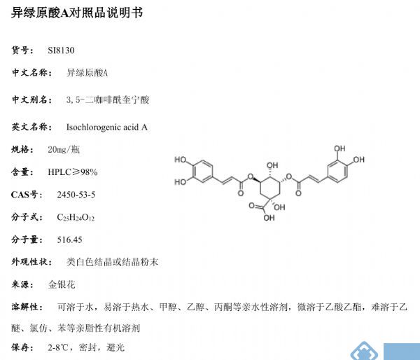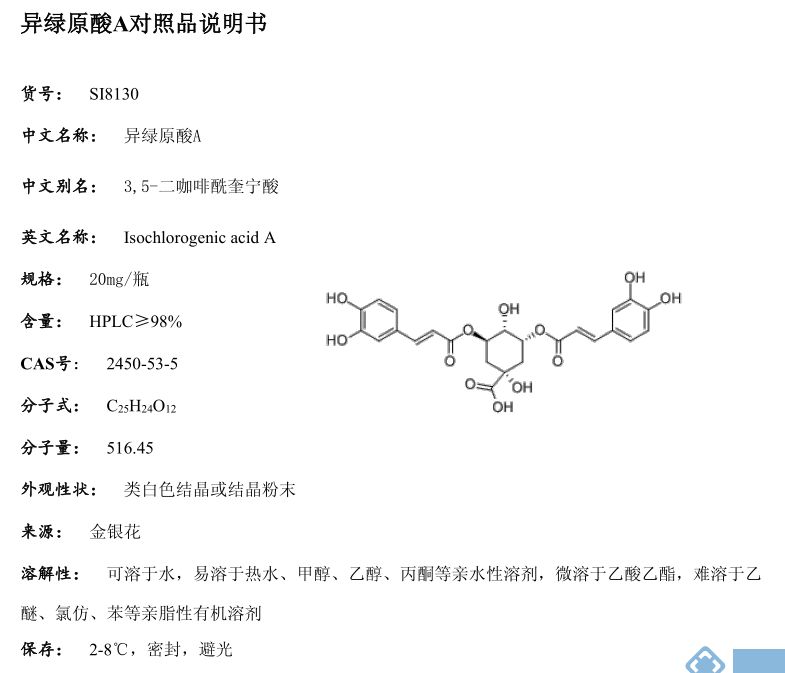 产品名称: 异绿原酸A标准品